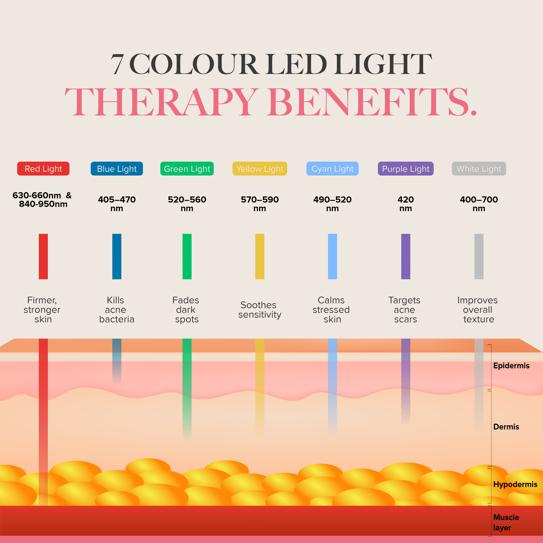 - Wavelengths: 7 clinically studied LED colours (Red, Blue, Green, Yellow, Cyan, Purple, White) targeting multiple skin concerns