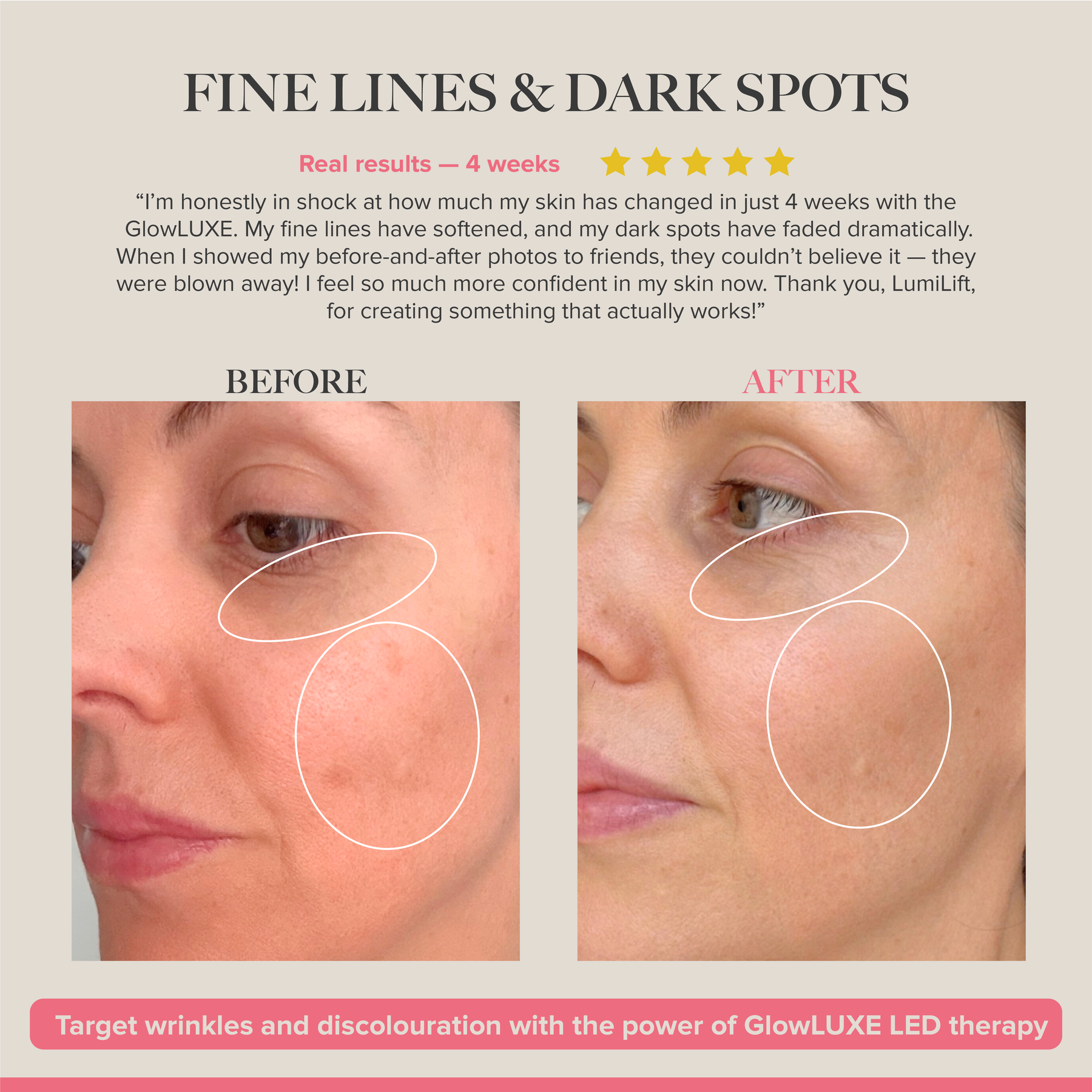“I can’t believe the difference in my skin in just 4 weeks! My fine lines and dark spots have faded dramatically — even my friends were blown away. I’m so happy!”