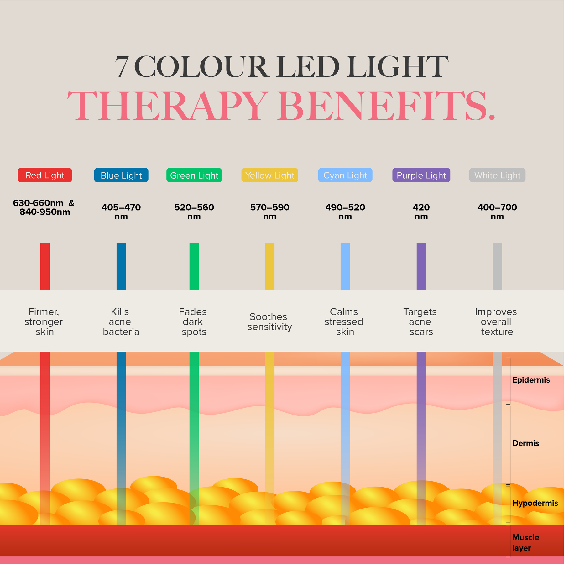 - Wavelengths: 7 clinically studied LED colours (Red, Blue, Green, Yellow, Cyan, Purple, White) targeting multiple skin concerns